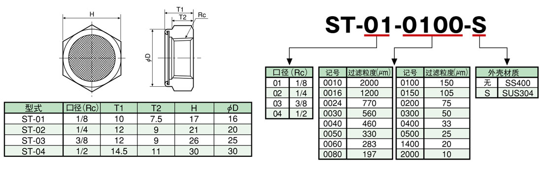 ST系列薄型滤芯口径有从Rc1/8到Rc1/2的4种。